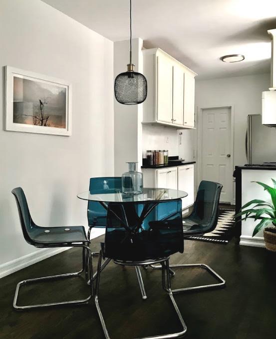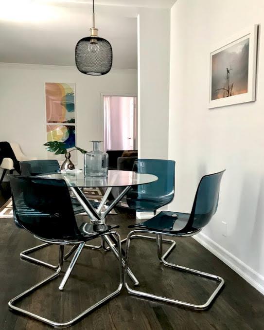 Staged with a young creative couple in mind, the modern furnishings were chosen to supplement the pieces left behind by the owner.