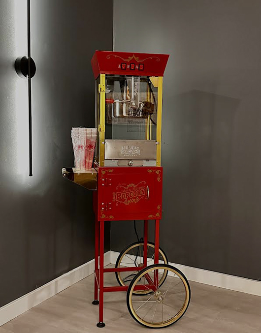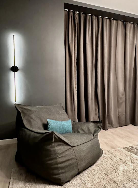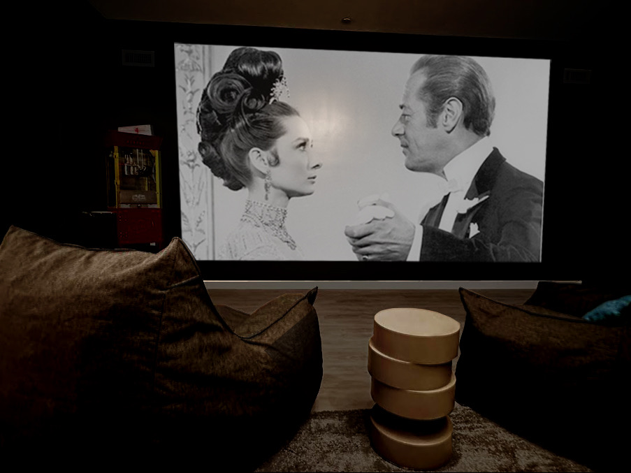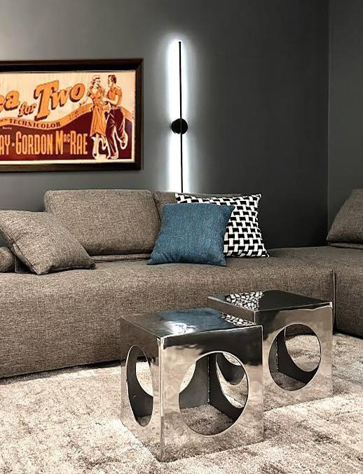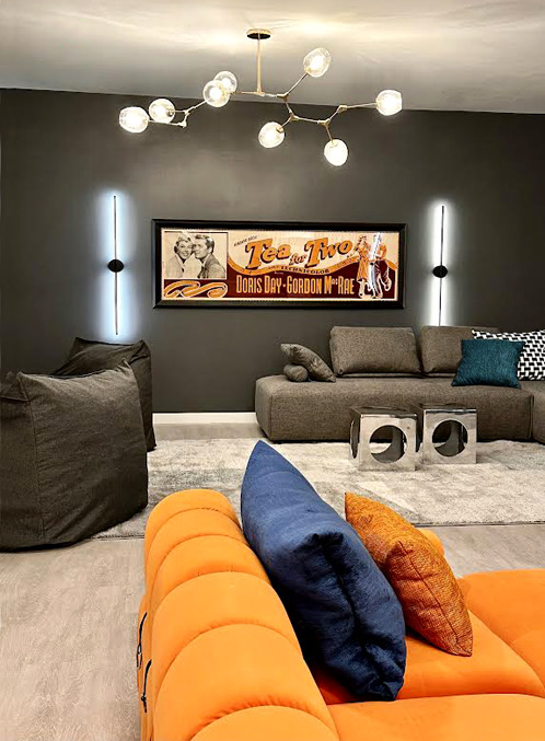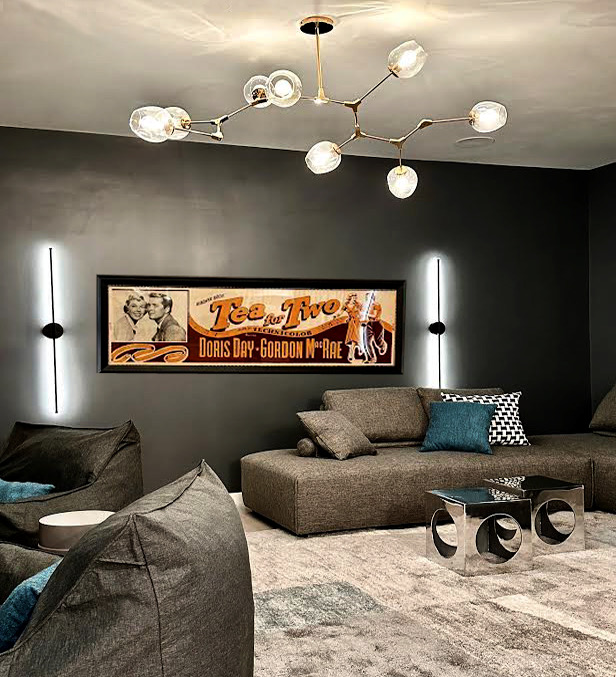 The theater / media room was designed with comfort and relaxation in mind. Neutral darker tones, metallic accents and original vintage artwork set the stage.