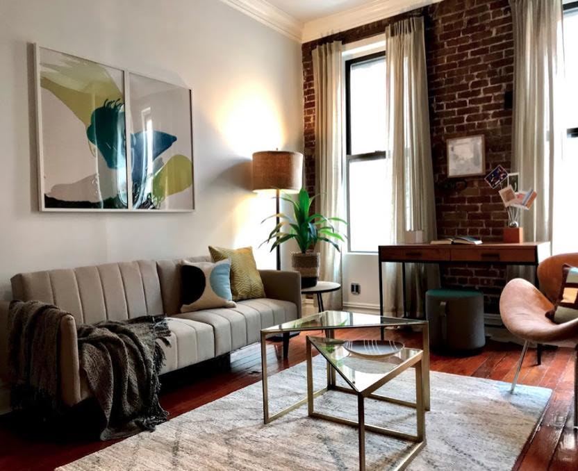 Staged to take advantage of original architectural elements like exposed bricks and wood floors, the modern furnishings and custom artwork create a very relatable environment that is quite apealing to potential buyers.