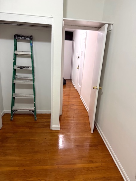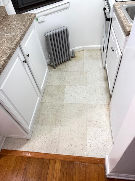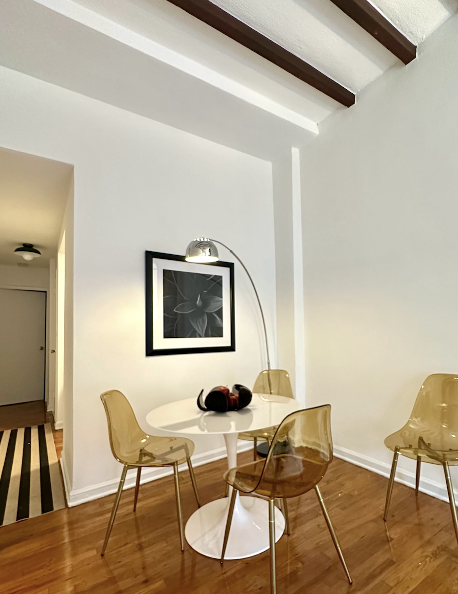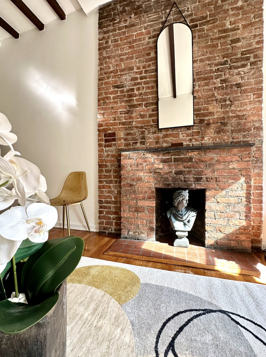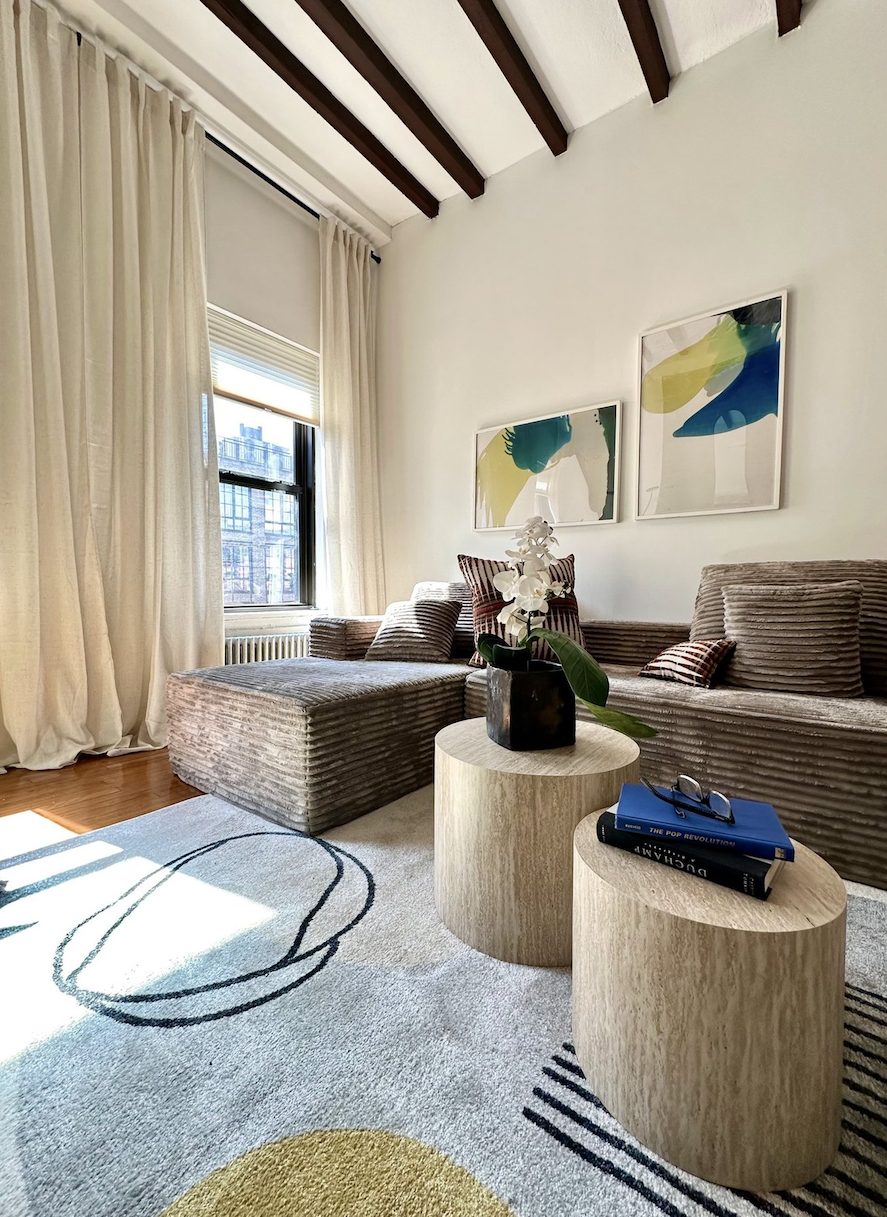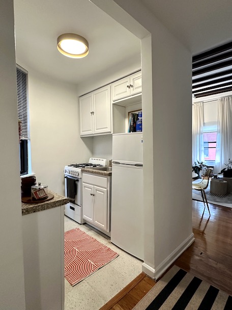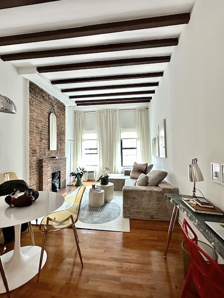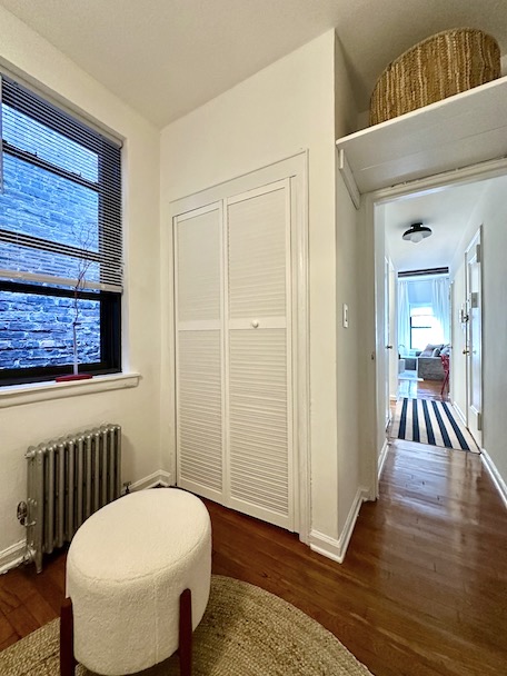 This fifth floor wall-up, its extra tall ceilings and amazing southern exposure, provide delightful amounts of light to the spacious social area.