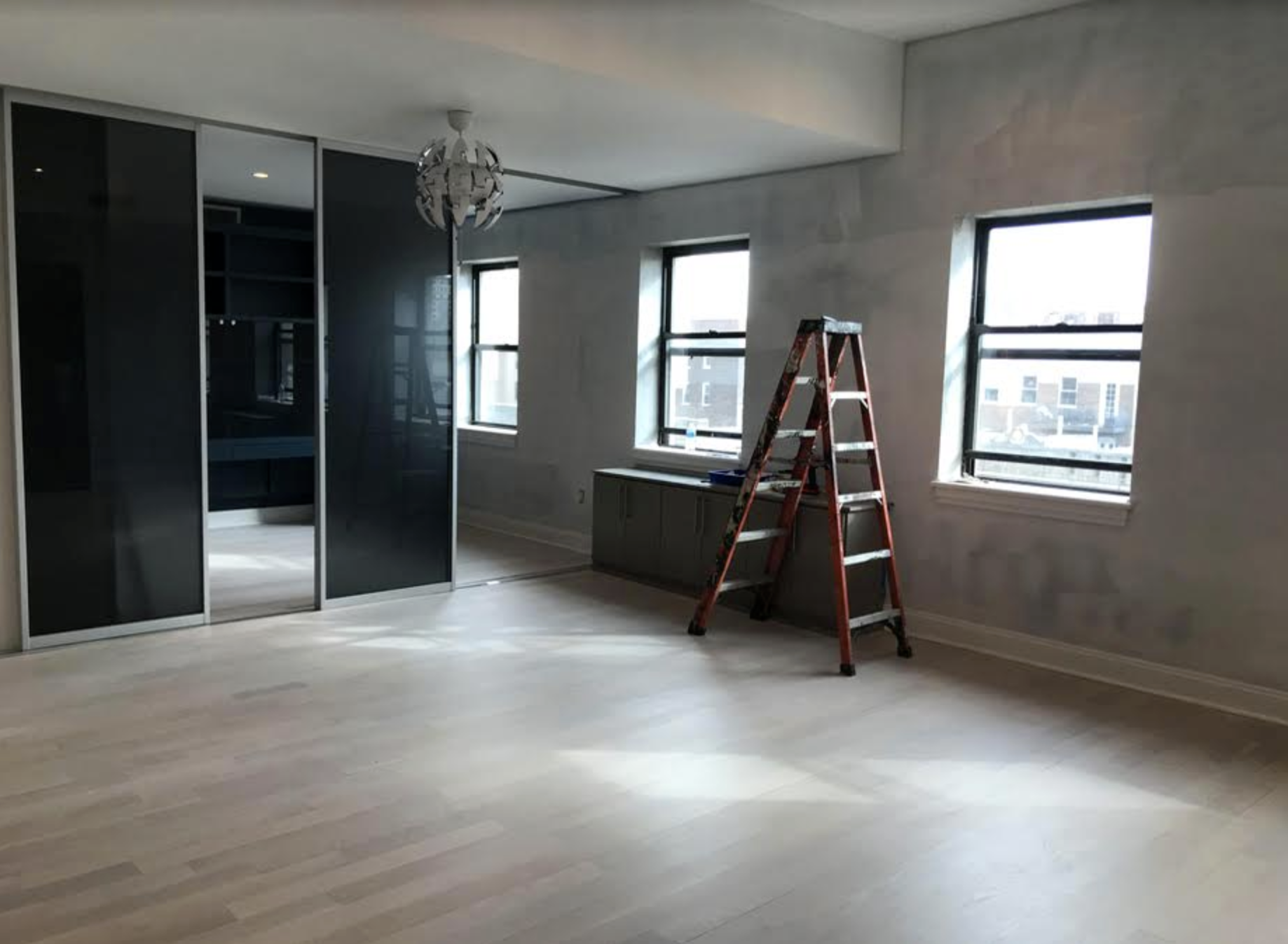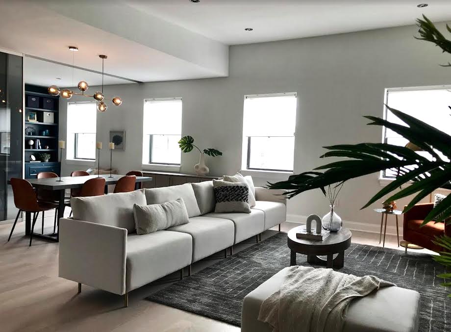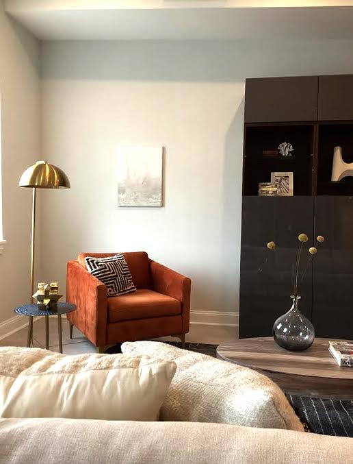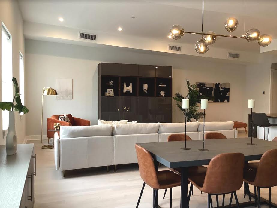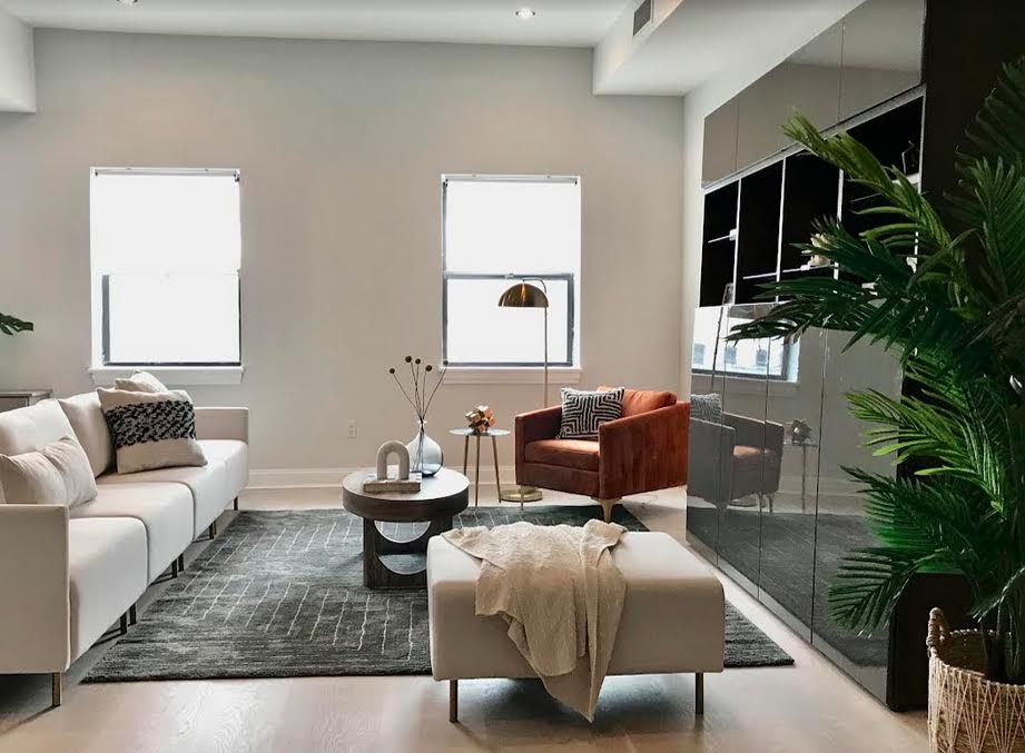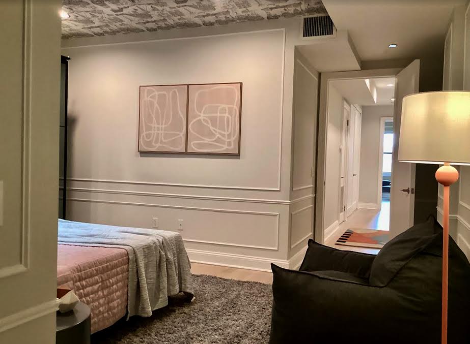 Furniture and prop sourcing, staging, painting services, custom soft goods, electric services, floor refinishing and original artwork complement the installation.